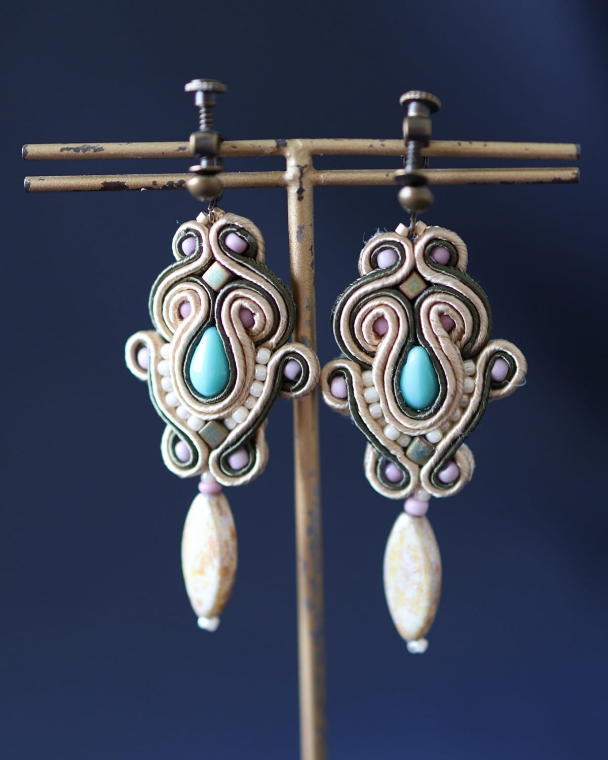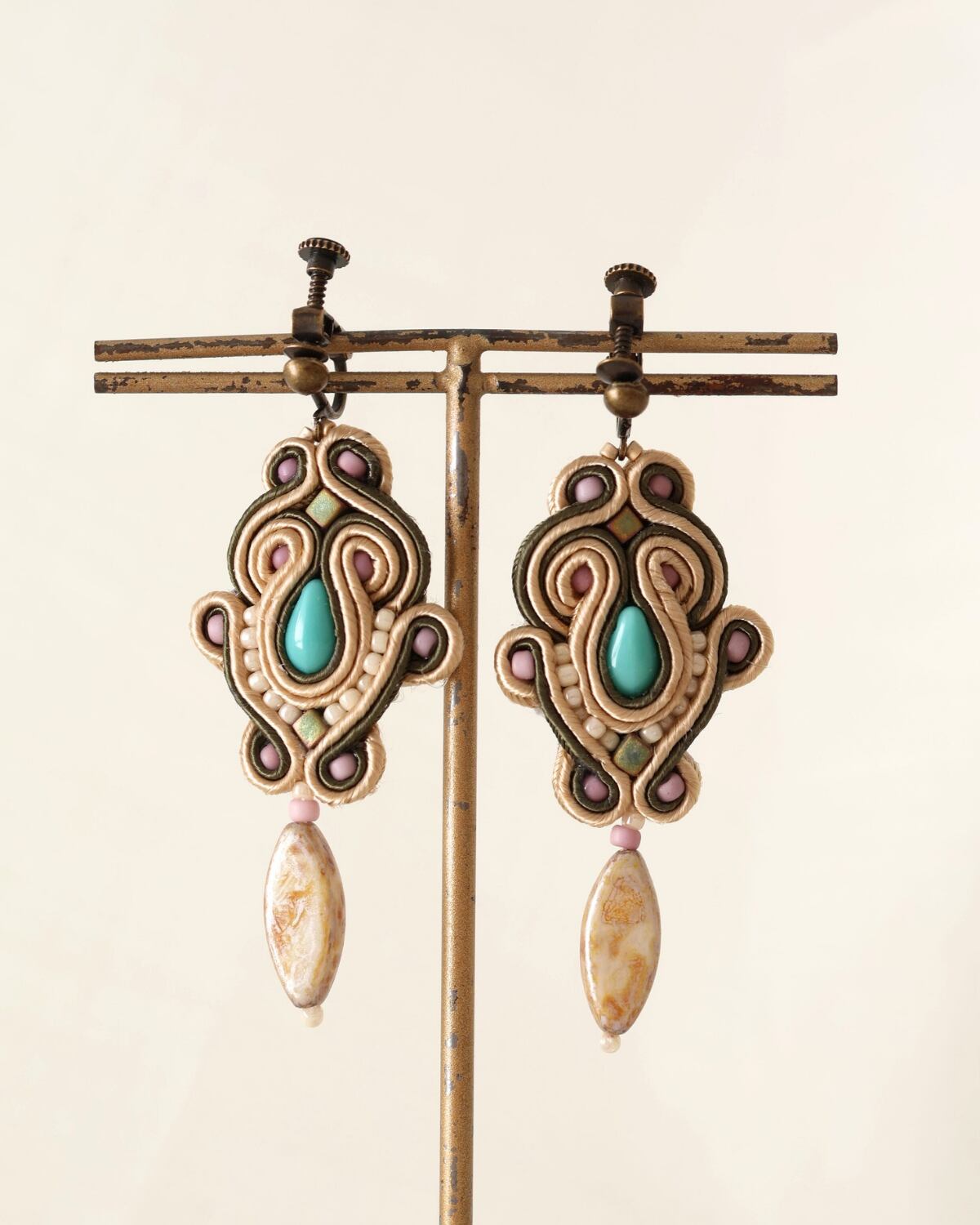ターコイズカラーのチェコガラスを包み込みました。