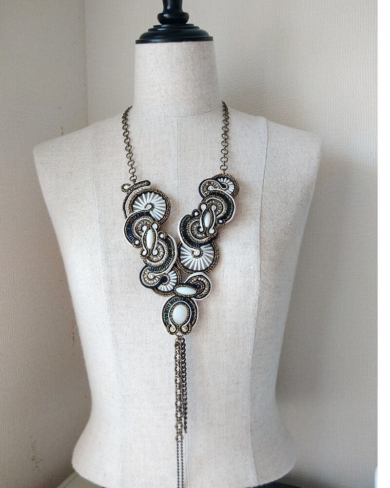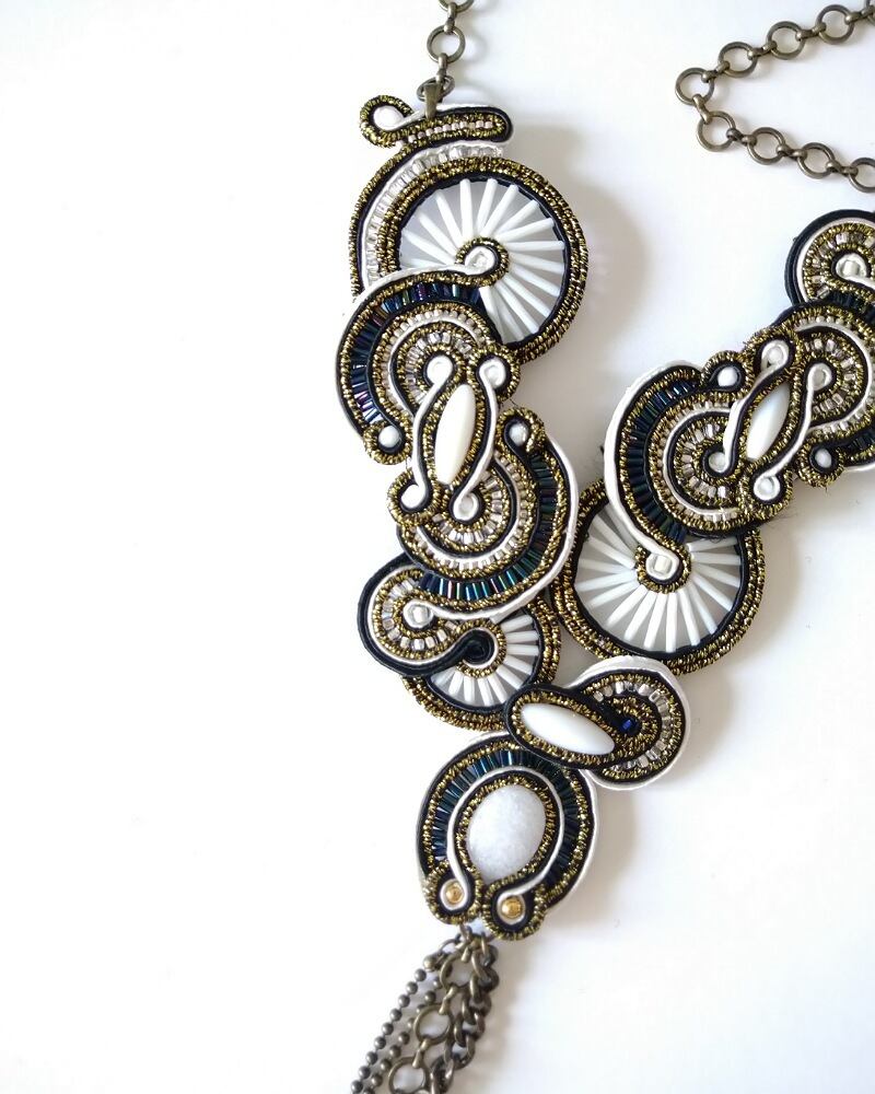 平紐(コード)を使い、天然石やスワロフスキーなど様々な素材を糸で縫いこみ、デザインしています。貴金属のジュエリーとは異なり、素材や色彩に限界がなく、遊び感覚と存在感が特徴です。大振りなデザインのものでも、とても軽量です。